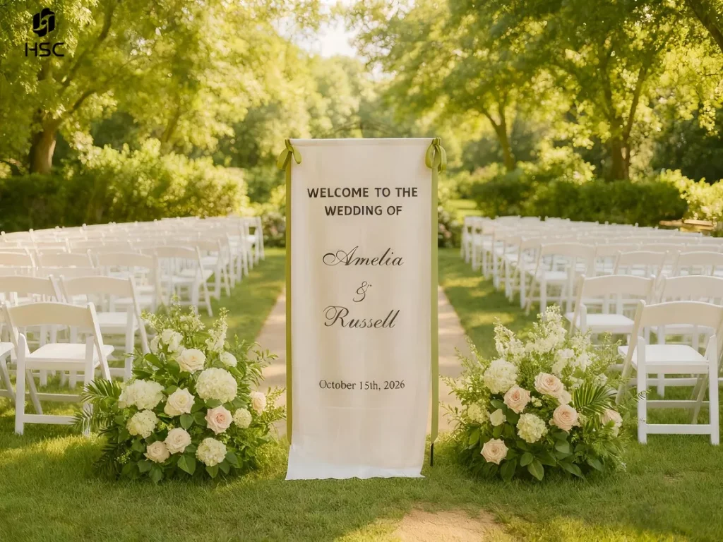 | Whimsical & Romantic | HSC Washable Linen Sign (Hand-Frayed Edges) | 3D hand-frayed edges + 165 GSM stone-washed texture | Infuses dynamic flow into the aisle, delivering the gentle tactility of a “country wedding” |